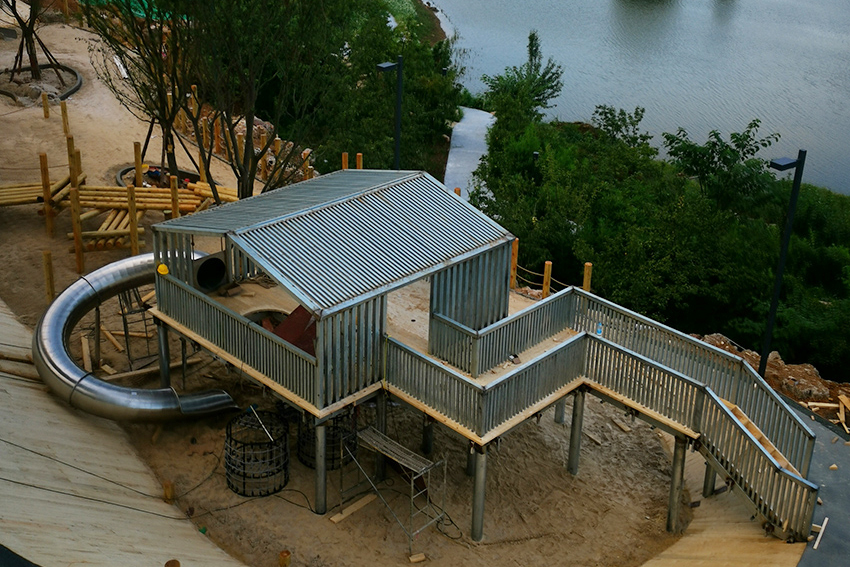 南宮地熱博覽園木屋滑梯兒童樂園由高樂迪玩具設計施工。多個木屋組合在一起,形成木屋村落,每個木屋之間由木質走廊、浮橋、鉆網(wǎng)、繩網(wǎng)橋等不同的形態(tài)連接在一起,孩子們可以自由穿梭在其間。
