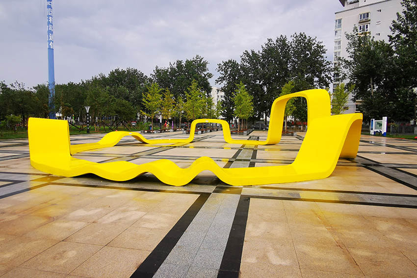 造型別致的椅子供游人們休息,鮮艷的色彩,就像是盛開的花朵。