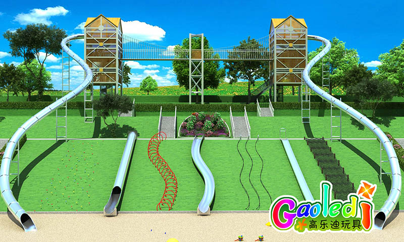 湖北恩施度假村兒童樂(lè)園總占地面積2000平米,此次高樂(lè)迪為度假村量身定制了超刺激的不銹鋼滑梯及兒童拓展。